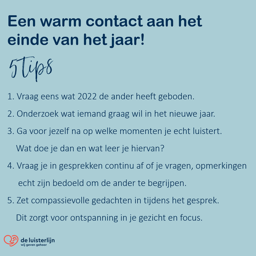 Vraag of het uitkomt dat je contact zoekt. Kies ervoor om de ander ‘goed luisteren’ als cadeau te geven. Luister met begrip. Verplaats je dan in de ander. Identificeer je eigen gevoelens. Wat voel je precies? Wees opmerkzaam: waar heeft de ander behoefte aan? Praat met liefde (Vermijd de woorden als ‘je moet’. Wil je toch je mening geven? Doe dat dan in de ik-boodschap of in de vorm van een vraag).