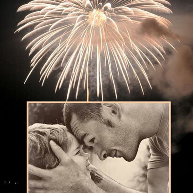 Heel voorzichtig legde de jongen de lont tegen de pijl aan, die gelijk begon te sissen. Snel stapte de jongen een paar stappen naar achteren en ging naast zijn vader staan. Samen keken ze omhoog naar hoe de vuurpijl uit elkaar knalde. Grote paarse en zilveren bloemen ontstonden er in de lucht, die vervolgens weer uit doofden. “Nu mag jij papa”, zei de jongen enthousiast.